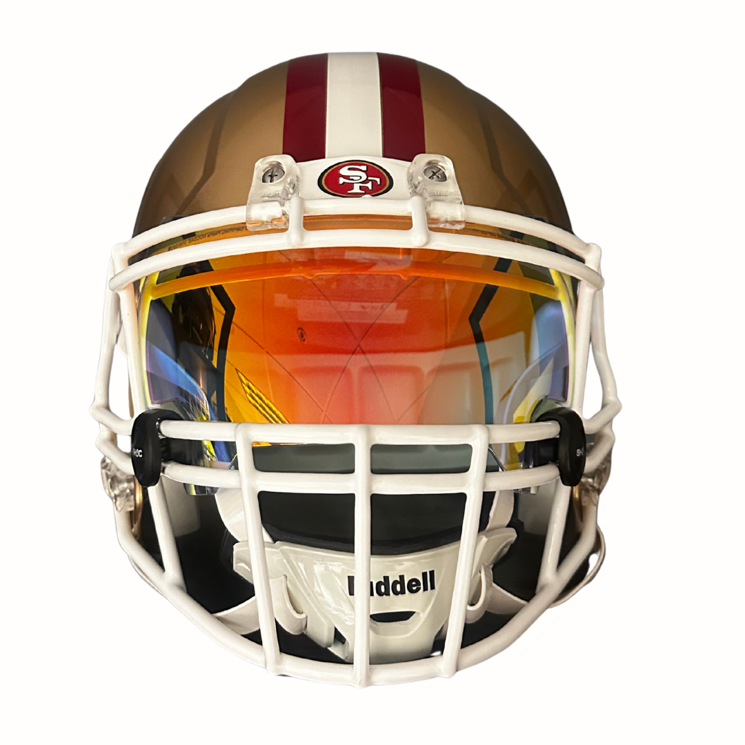 Set on a traditional San Francisco 49ers Replica Speed shell, this helmet is elevated with an aftermarket white Riddell S2BD-HS4-1P facemask, delivering a crisp, clean contrast against the iconic red and gold colorway. A clear red SHOC Zero G Plus visor adds a subtle yet aggressive pop of color, enhancing the helmet’s intensity while staying true to classic 49ers aesthetics. Completing the build is an all-white hard-shelled chin strap, tying the look together with a sharp, on-field finish.